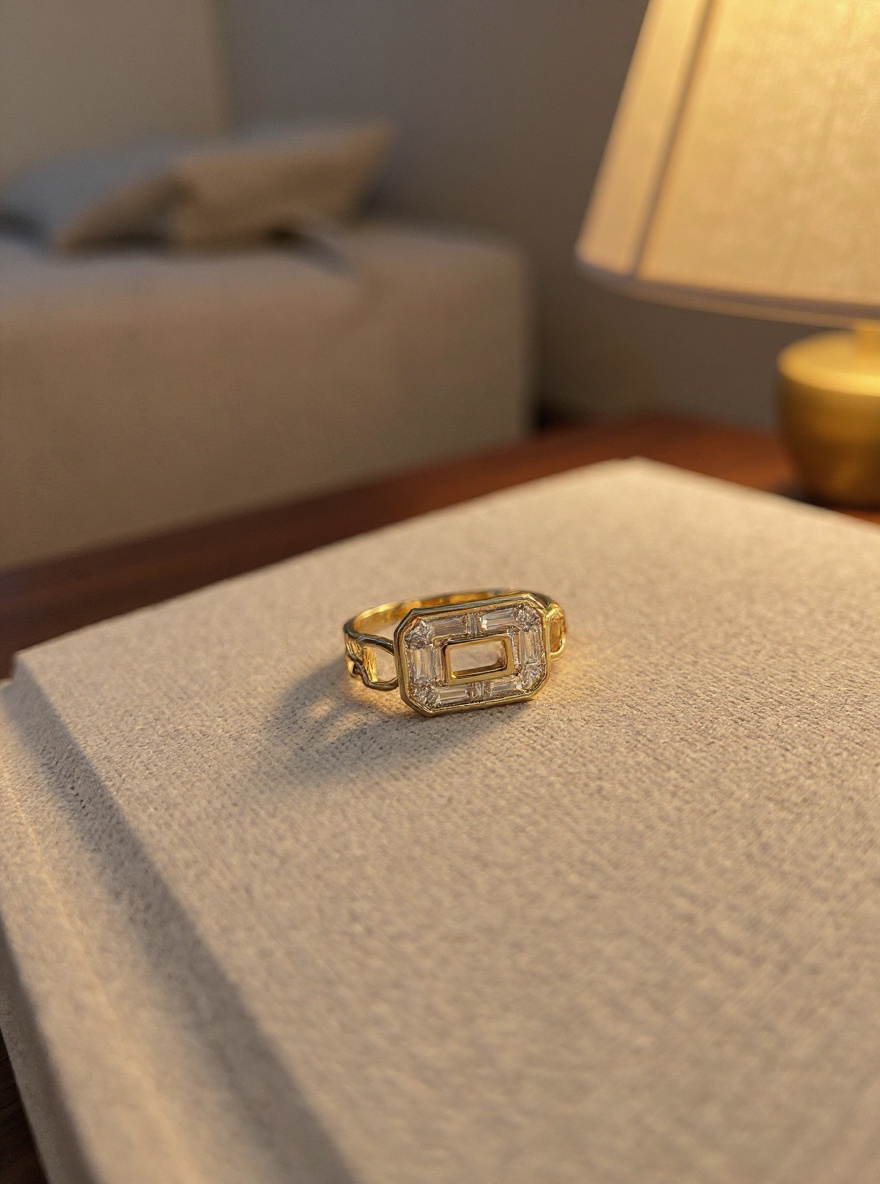 Dayanıklı çelikten üretilen bu ayarlanabilir yüzük, formu dikdörtgen taşlarla zarifçe süslenmiştir. Gold renk kaplaması ile şıklığı yakalayan Aurora Collection parçası, her parmağa kolaylıkla uyum sağlar ve her anınıza sofistike bir dokunuş katar. Modern ve şık tasarımın vazgeçilmezi.