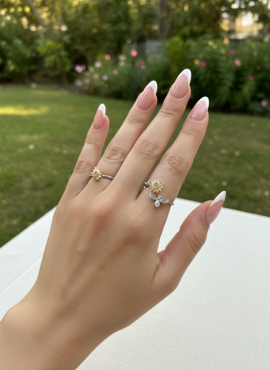 Güneş figürüyle tasarlanmış bu dönen stres yüzüğü, şıklığı ve rahatlamayı bir arada sunar. Silver rengi sayesinde her tarzla uyum sağlar. Döner yapısı stresli anlarda odaklanmayı kolaylaştırır, gün boyu konfor ve zarafet sağlar. Stresinizi hafifletmek için ideal bir aksesuar.