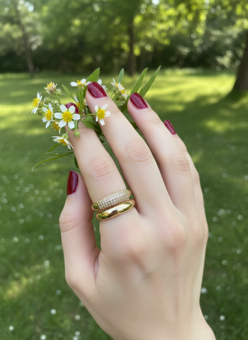 - Zarif tasarımıyla dikkat çeken bu yüzük, kadın ve kızların şıklığını tamamlar.; - Parlak yüzeyi sayesinde göz alıcı bir parlaklık sunar ve her türlü kıyafetle uyum sağlar.; - Paslanmaz çelik materyali ile uzun ömürlü kullanım vaat eder ve dayanıklılığıyla ön plana çıkar.; - Zirkon taş detayları, her bakışta ışıltınızı artırarak özel günlerde veya günlük kullanımda fark yaratır.; - CN menşeli ürün, kaliteli işçiliği ve modern tasarım anlayışını bir arada sunar.; - Bakım kolaylığı sağlayan nemli bezle silme özelliği ile temizliği pratik ve hızlıdır.;